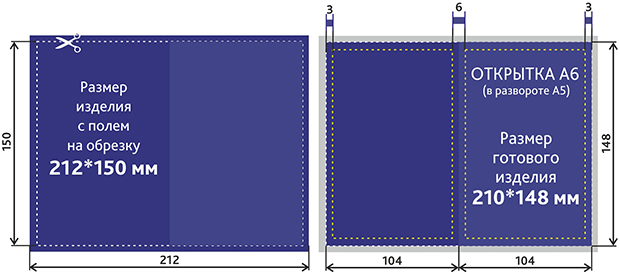 Размер открытки с припусками на обрез 212x150 мм (т.е. по 1 мм с каждого края);